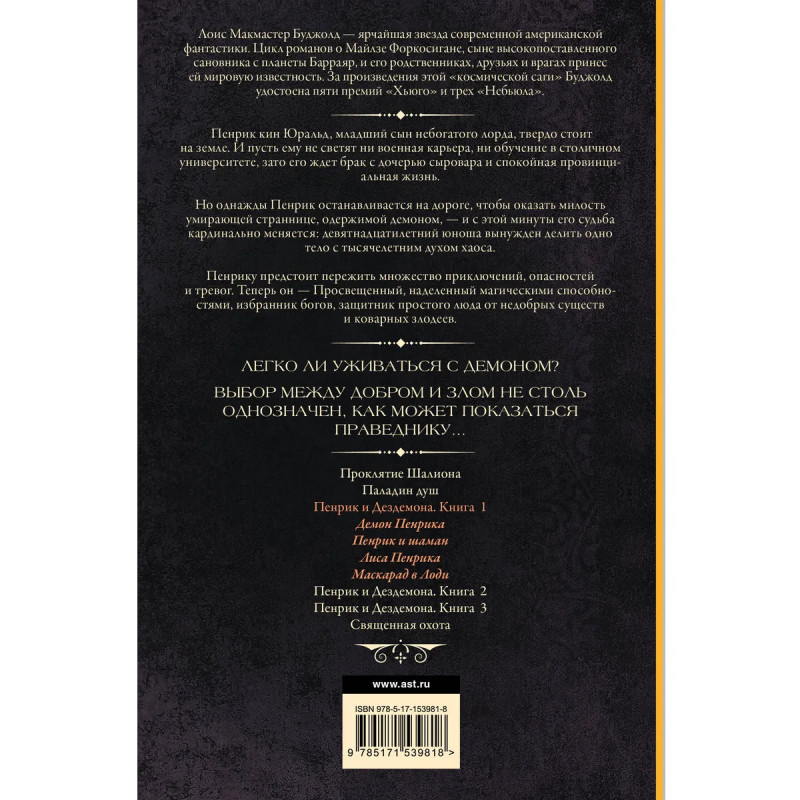 От автора культового цикла Барраяр. Для всех поклонников классического фэнтези. Первая книга о Пенрике и Дездемоне. Пенрик кин Юральд младший сын небогатого провинциального лорда, и еще недавно вся его жизнь была расписана наперед. Ему не светили ни военная карьера, ни обучение в столичном университете, а самым волнительным событием была женитьба на дочери местного сыровара. Однако все изменилось, стоило только Пенрику обрести собственного демона, живущего внутри его тела. Теперь Пенрику и демону, получившему имя Дездемона, светит жизнь насыщенная и полная интересных событий: в ней будут расследования преступлений, борьба со злодеями и чудовищами, секретные миссии и прочие приключения.