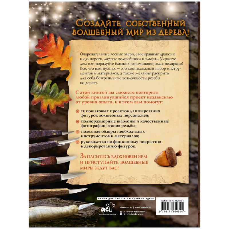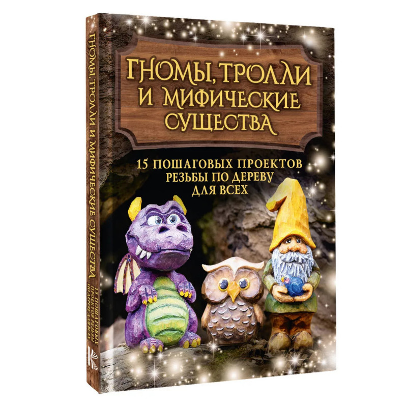 Гномы, тролли и мифические существа: 15 пошаговых проектов резьбы по дереву для всех. Создайте собственный волшебный мир из дерева! Очаровательные лесные звери, своенравные драконы и единороги, мудрые волшебники и эльфы Украсьте дом или порадуйте близких запоминающимся подарком! Все, что вам нужно - это минимальный набор инструментов и материалов, а также желание раскрыть для себя безграничные возможности резьбы по дереву. С этой книгой вы сможете повторить любой приглянувшийся проект, независимо от уровня опыта, и в этом вам помогут: - 15 пошаговых проектов для вырезания фигурок волшебных персонажей; - Полноразмерные шаблоны и качественные фотографии этапов резьбы; - Полезные обзоры необходимых инструментов и материалов; - Руководство по финишному покрытию и декорированию фигурок. Запаситесь вдохновением и приступайте. Волшебные миры ждут вас!