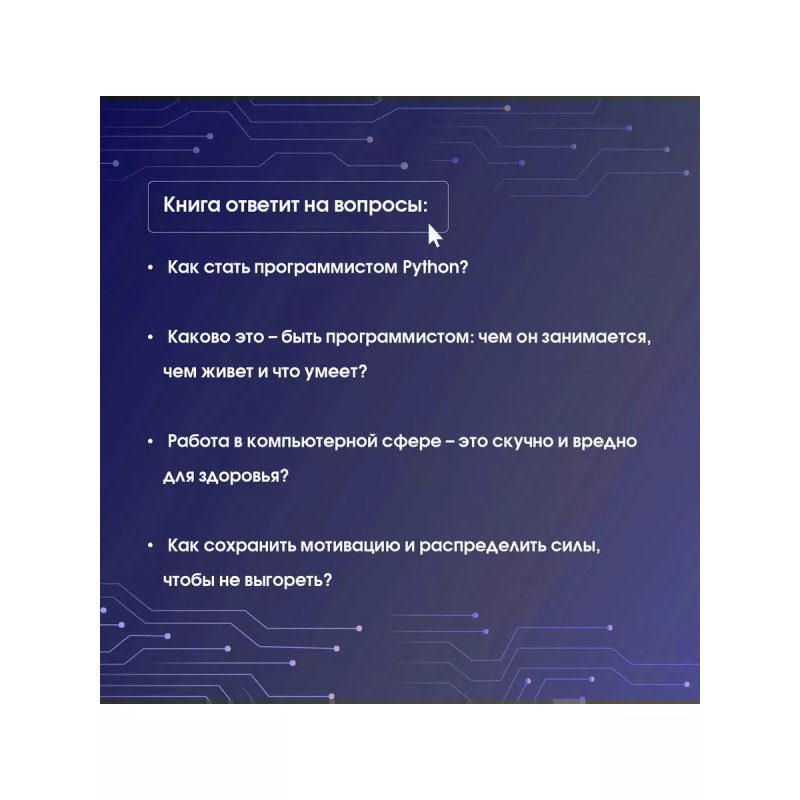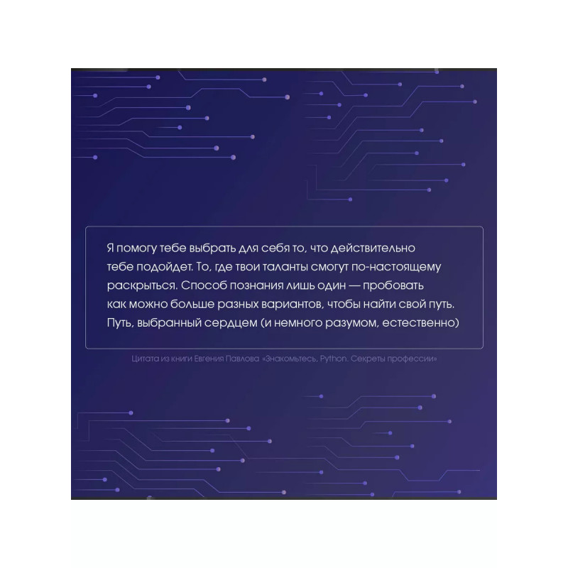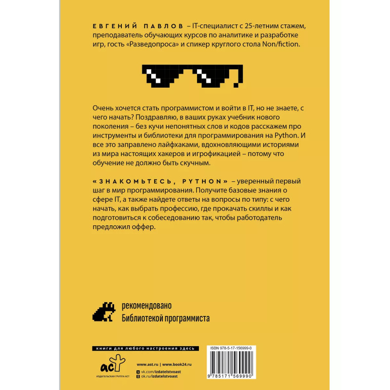 Знакомьтесь, Python. Секреты профессии. Просто взять и уйти в IT? Легко! Заручившись поддержкой и рекомендациями профессионала! Книга "Знакомьтесь, Python. Секреты профессии" расскажет о том, как устроена сфера программирования, какие "подводные камни" подстерегают новичков и как по-настоящему раскрыть свои таланты на этом поприще. Руководство поможет разобраться с Питоном и освоить основной инструментарий программиста. В нем приведены QR-коды и ссылки на полезные ресурсы, интересные факты и пошаговые алгоритмы - без воды и сложных терминов. А еще - лайфхаки о том, как сохранить мотивацию, распределить силу, "не выгореть" на работе и пройти собеседование на вакансию мечты.