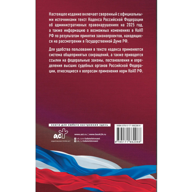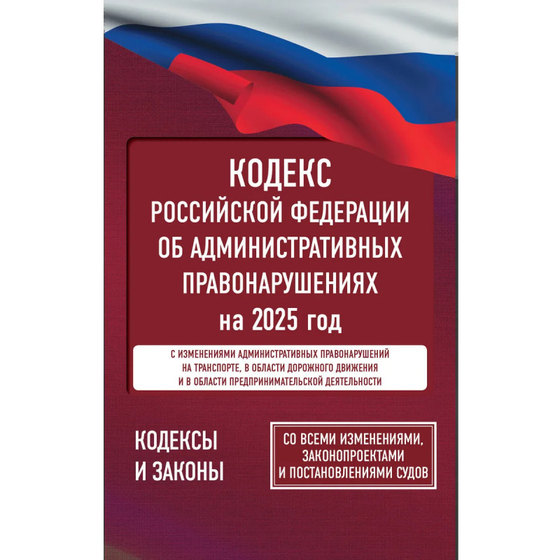Данное издание кодекса Российской Федерации об административных правонарушениях сверено с официальным источником и приводится по состоянию на 2025 год. Кодекс учитывает все изменения, опубликованные в официальных источниках на момент подписания издания в печать. В издании представлена информация о возможных изменениях в КоАП РФ по результатам принятия законопроектов, находящихся на рассмотрении в Государственной Думе РФ. Для удобства пользования в тексте кодекса применяется система общепринятых сокращений, а также приводятся ссылки на федеральные законы, постановления Правительства Российской Федерации, постановления и определения высших судебных органов Российской Федерации, относящиеся к вопросам применения норм КоАП РФ.