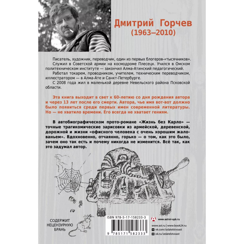 Жизнь без Карло. Музыка для экзальтированных старцев. Эта книга выходит в свет к 6-летию со дня рождения автора и через 13 лет после его смерти. Автора, чье имя вот-вот должно было появиться среди первых имен современной литературы. Но - не хватило времени. Его всегда не хватает гениям. В автобиографическом прото-романе "Жизнь без Карло" - точные трагикомические зарисовки из армейской, деревенской, дорожной и жизни "офисного человека с очень хорошим жалованьем". Вдохновенно, отчаянно, горько - о том, как это было, зачем оно так есть и почему никогда не изменится. Всё так, как это задумал автор. Об авторе: Дмитрий Горчев (1963-21). Писатель, художник, переводчик, один из первых блогеров-"тысячников". Родился в Казахстане, окончил Алма-Атинский педагогический институт иностранных языков (ныне Казахский университет международных отношений и мировых языков). В конце 9-х переехал в Петербург и работал главным художником издательства "Ге ликон Плюс" и журнала Бориса Стругацкого "Полдень. XXI век". С 1999 по 213 год издано 14 авторских сборников. Был одним из гостей ле