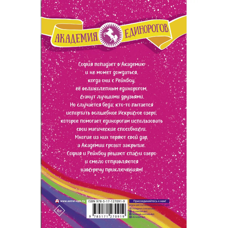 София и Рейнбоу. София попадает в Академию и не может дождаться, когда они с Рейнбоу, её великолепным единорогом, станут лучшими друзьями. Но случается беда: кто-то пытается испортить волшебное Искристое озеро, которое помогает единорогам использовать свои магические способности. Многие из них теряют свой дар, а Академии грозит закрытие. София и Рейнбоу решают спасти озеро и смело отправляются навстречу приключениям!