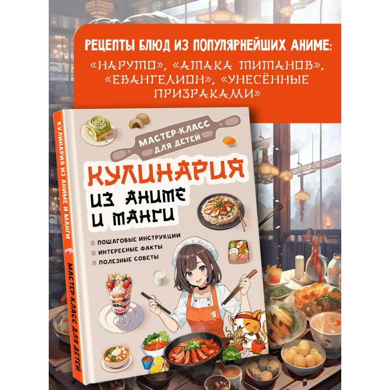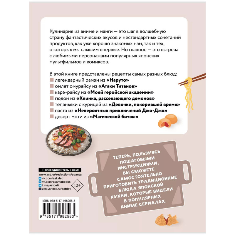 Легендарный рамэн и обожаемый всеми японцами десерт данго из "Наруто", нежный омлет омурайсу из "Атаки Титанов", популярный мисо-суп из "Евангелиона" рецепты этих и множества других аппетитных блюд, которые встречаются в любимых вами аниме и манге, вы найдете на страницах этой книги. Пошаговые инструкции, полезные советы, интересные факты, познавательные истории, яркие иллюстрации помогут вам освоить азы приготовления разнообразной вкусной еды, а главное окунуться в самый популярный на сегодняшний день вид японского искусства, познакомиться скультурой и традициями этой удивительной страны. Для среднего и старшего школьного возраста.