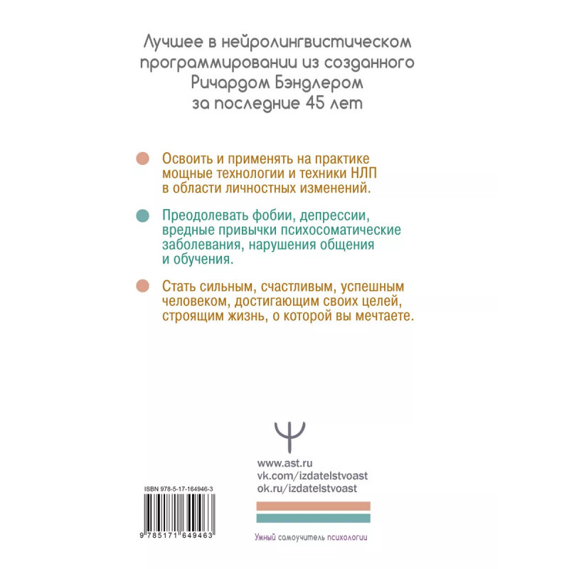 Хотите освоить техники, которые помогут вам достичь успеха в любой сфере жизни? "НЛП. Энциклопедия для начинающих" от Ричарда Бэндлера это идеальное руководство для тех, кто хочет познакомиться с миром нейролингвистического программирования. В этой книге вы найдете простые и понятные объяснения основных принципов НЛП, а также множество упражнений и техник, которые помогут вам улучшить коммуникацию, повысить самооценку, управлять своими эмоциями и достигать поставленных целей. Энциклопедия НЛП в форме простой, но увлекательной истории поможет: понять замечательные принципы данного подхода; освоить и применять на практике мощные технологии и техники НЛП в области личностных изменений; преодолевать фобии, депрессии, вредные привычки, психосоматические заболевания, нарушения общения и обучения; стать сильным, счастливым, успешным человеком, достигающим своих целей, строящим жизнь, о которой вы мечтаете. Начните свой путь к лучшей версии себя уже сегодня с помощью этой книги!
