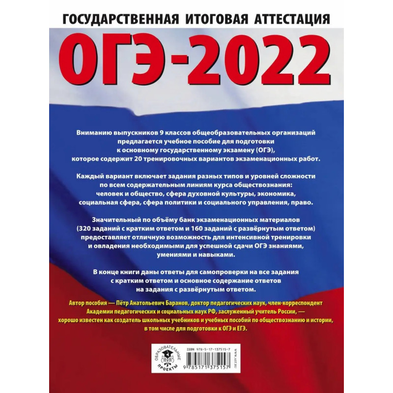 Вниманию выпускников 9 классов общеобразовательных организаций предлагается учебное пособие для подготовки к основному государственному экзамену (ОГЭ), которое содержит 2 типовых вариантов экзаменационных работ. Каждый вариант включает задания разных типов и уровня сложности по всем содержательным блокам-модулям курса обществознания: человек и общество, сфера духовной культуры, экономика, социальная сфера, сфера политики и социального управления, право.
