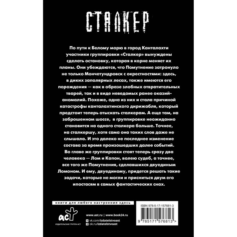 Зона Севера. Двуединый. По пути к Белому морю в город Канталахти участники группировки "Сталкер" вынуждены сделать остановку, которая в корне меняет их планы. Они убеждаются, что Помутнение затронуло не только Мончетундровск с окрестностями: здесь, в диких заполярных лесах, также имеются его порождения - как в образе злобных отвратительных тварей, так и в виде неведомых ранее оказий-аномалий. Похоже, одна из них и стала причиной катастрофы канталахтинского дирижабля, который предстоит теперь отыскать сталкерам. А еще там, на заброшенном шоссе, в группировке неожиданно становится на одного сталкера больше. Точнее, на сталкершу, хотя сама она таких слов даже не слышала. И это далеко не последнее изменение состава за время произошедших далее событий. Во главе же группировки стоят теперь сразу два человека - Лом и Капон, волею судеб, а точнее, все того же Помутнения, сделавшихся двуединым Ломоном. И ему, двуединому, придется решать такие задачи, которые не могли и присниться двум его ипостасям в самых фантастических снах.