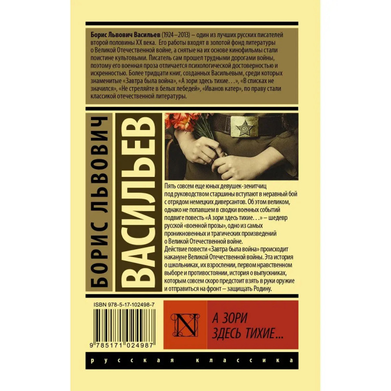 Пять совсем еще юных девушек-зенитчиц под руководством старшины вступают в неравный бой с отрядом немецких диверсантов. Об этом великом, однако не попавшем в сводки военных событий подвиге повесть "А зори здесь тихие" шедевр русской "военной прозы", одно из самых проникновенных и трагических произведений о Великой Отечественной войне. Действие повести "Завтра была война" происходит накануне Великой Отечественной войны. Это история о школьниках, их взрослении, первом нравственном выборе и противостоянии, история о выпускниках, которым совсем скоро предстоит взять в руки оружие и отправиться на фронт защищать Родину.