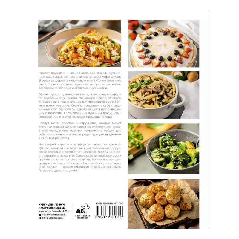 Привет, друзья! Я Елена Ландэ, бренд-шеф ВкусВилла и ваш надежный гид в увлекательном мире вкусов. В руках вы держите мою новую книгу Точно готовим!, где я поделюсь с вами лучшими из лучших рецептов, созданными с любовью и страстью к кулинарии. Это не просто кулинарная книга, а настоящее сафари по вкусовым ощущениям, где каждое блюдо, однажды бывшее новинкой, сквозь время превратилось в любимую всеми классику. Сложно представить себе праздничный стол без хотя бы одного рецепта из приведенных пятидесяти, вдохновленных лучшими традициями мировой кухни и отточенных за прошедшие годы. Следуя моим простым инструкциям, каждый может стать настоящим шеф-поваром на собственной кухне, а уже искушенные маэстро непременно найдут для себя что-то новое и улучшат рецептуру уже введенных в свой быт рецептов.