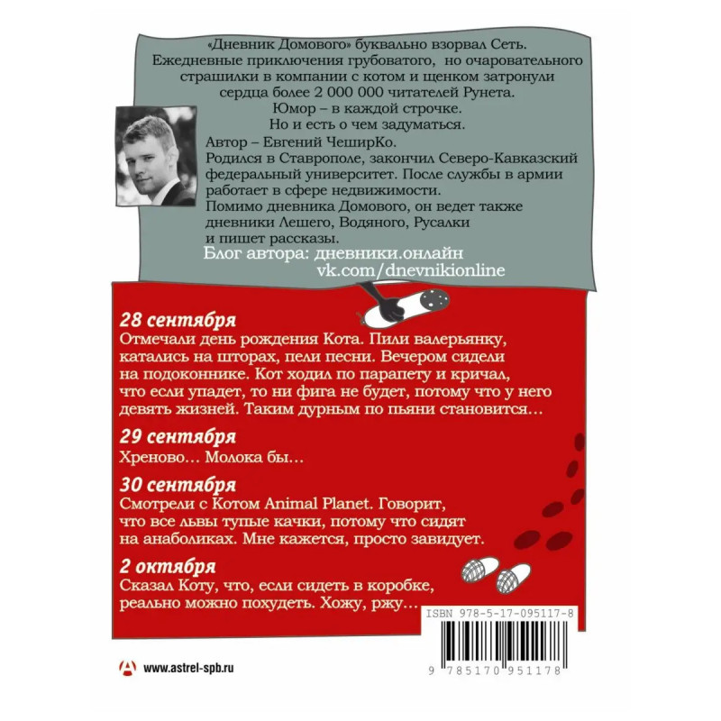 "Дневник Домового" буквально взорвал Сеть. Ежедневные приключения грубоватого, но очаровательного страшилки в компании с котом и щенком затронули сердца более 2 читателей Рунета. Юмор в каждой строчке. Но и есть о чем задуматься. Автор Евгений ЧеширКо. Родился в Ставрополе, закончил Северо-Кавказский федеральный университет. После службы в армии работает в сфере недвижимости. Помимо дневника Домового, он ведет так же дневники Лешего, Водяного, Русалки и пишет рассказы.
