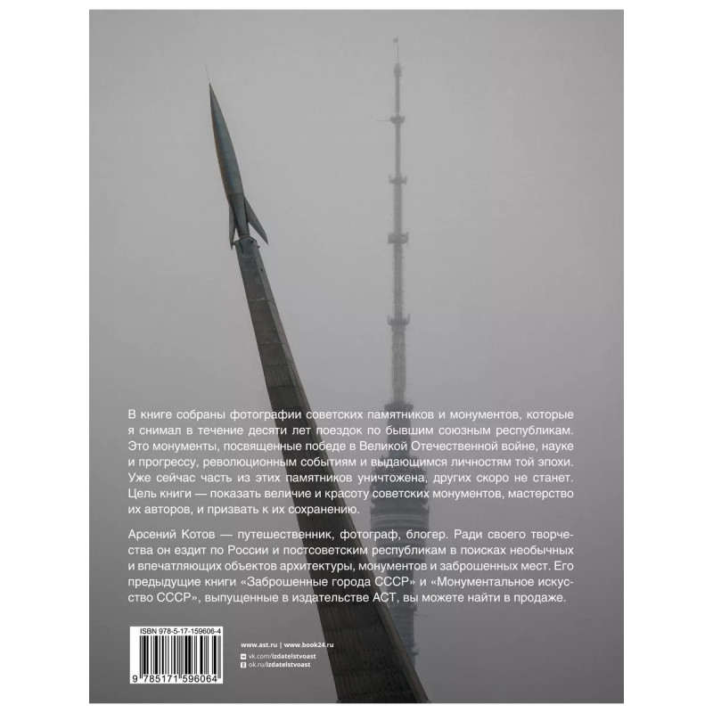 Советские монументы. Беречь память Если вы интересуетесь культурным наследием советской эпохи и памятниками монументального искусства, обратите внимание на новую книгу фотографа-документалиста Арсения Котова "Советские монументы". В книге автор собрал снимки знаковых памятников и монументов, которые снимал в течение десяти лет в разных уголках бывших союзных республик. "Аврора", "Огонь Вечной Славы", "Мужество", "Защитникам Советского Заполярья в годы Великой Отечественной войны" - это монументы, посвященные победе в Великой Отечественной войне, а также науке и прогрессу, революционным событиям и выдающимся представителям культуры и искусства той эпохи. Эти памятники культуры безвозвратно уходят в прошлое. Призывая к сохранению монументов, автор хочет показать их красоту и мастерство авторов.