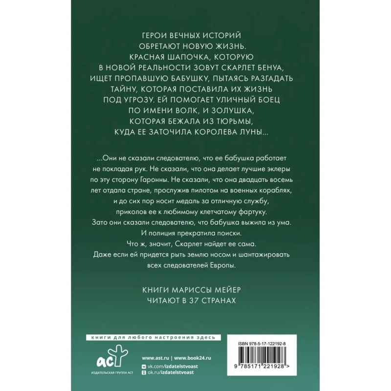 Бестселлер The New York Times. 2-я часть цикла Лунные Хроники. Герои вечных историй обретают новую жизнь. Лучший после Гарри Поттера квест в поисках волшебства. - Wall Street Journal Терминатор, Звездные войны, Золушка и Белоснежка - спасибо Мариссе Мейер за удивительный микст наших любимых сюжетов! - USAToday(точка)com Cтарая сказка на новый лад - знакомый сюжет перенесен в настолько необычный мир, что совершенно не знаешь, что же будет дальше! - FantLab(точка)ru