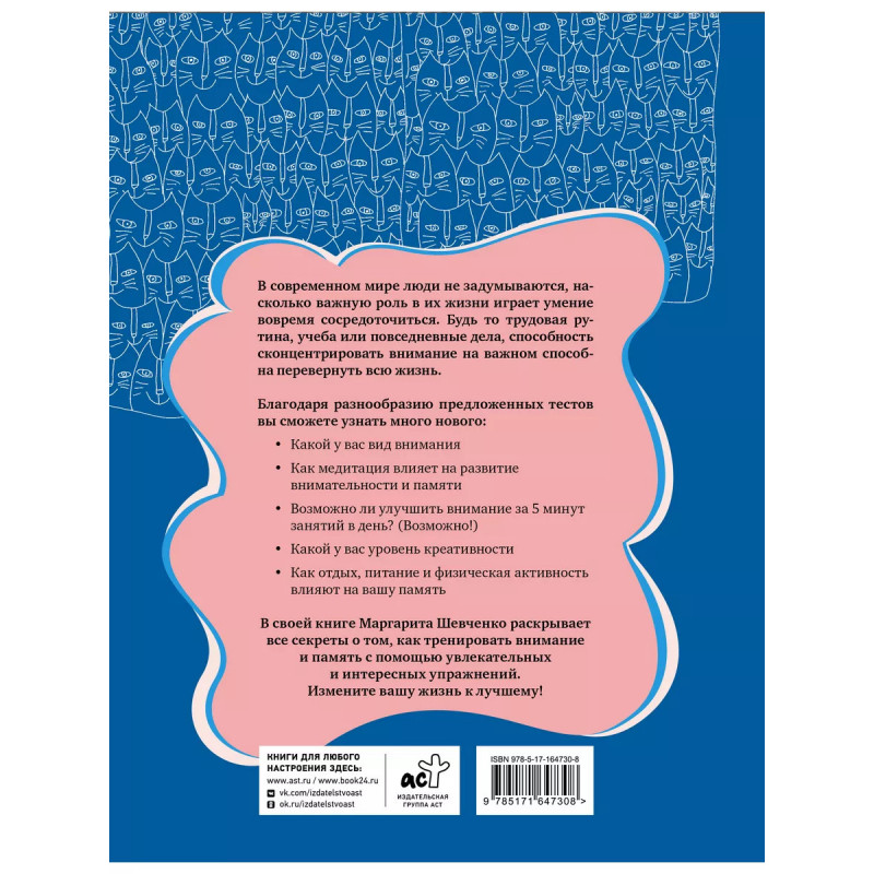 В современном мире люди не задумываются, насколько важную роль в их жизни играет умение вовремя сосредоточиться. Будь то трудовая рутина, учеба или повседневные дела, способность сконцентрировать внимание на важном способна перевернуть всю жизнь. Благодаря разнообразию предложенных тестов вы сможете узнать много нового: Какой у вас вид внимания Как медитация влияет на развитие внимательности и памяти Возможно ли улучшить внимание за 5 минут занятий в день? (Возможно!) Какой у вас уровень креативности Как отдых, питание и физическая активность влияют на вашу память В своей книге Маргарита Шевченко раскрывает все секреты о том, как тренировать внимание и память с помощью увлекательных и интересных упражнений. Измените вашу жизнь к лучшему!