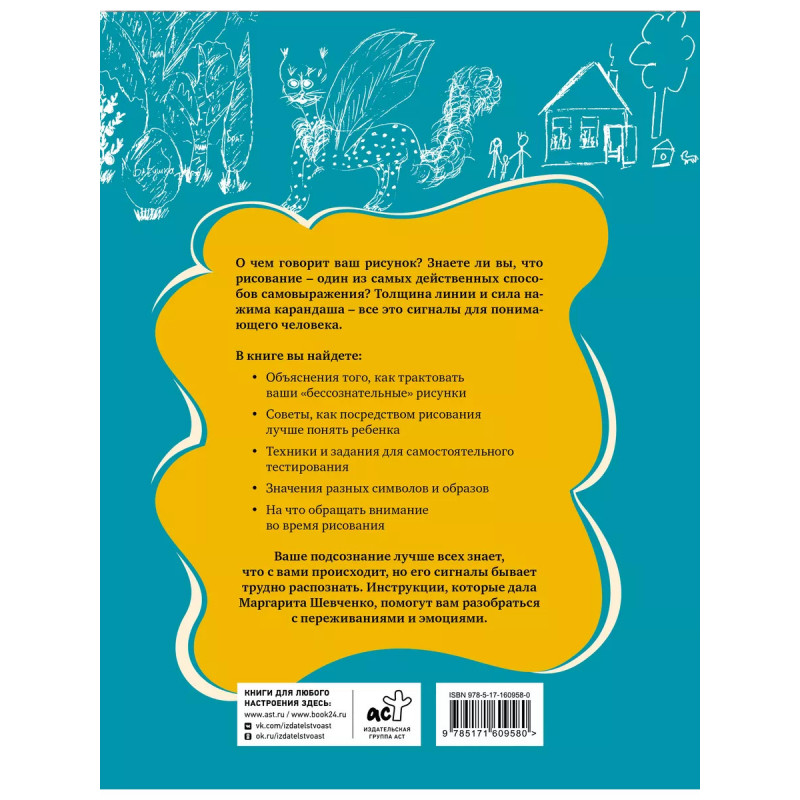 О чем говорит ваш рисунок? Знаете ли вы, что рисование - один из самых действенных способов самовыражения? Толщина линии и сила нажима карандаша - все это сигналы для понимающего человека. В книге вы найдете: " Объяснения того, как трактовать ваши "бессознательные" рисунки " Советы, как посредством рисования лучше понять ребенка " Техники и задания для самостоятельного тестирования " Значения разных символов и образов " На что обращать внимание во время рисования Ваше подсознание лучше всех знает, что с вами происходит, но его сигналы бывает трудно распознать. Инструкции, которые дала Маргарита Шевченко, помогут вам разобраться с переживаниями и эмоциями.