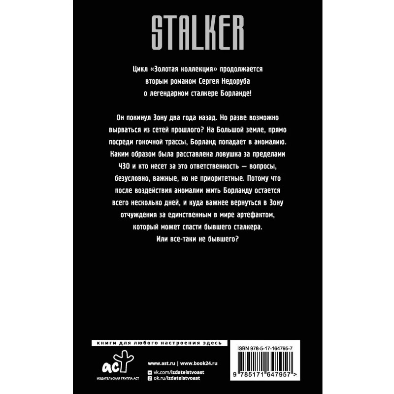 Цикл "Золотая коллекция" продолжается вторым романом Сергея Недоруба о легендарном сталкере Борланде! Он покинул Зону два года назад. Но разве возможно вырваться из сетей прошлого? На Большой земле, прямо посреди гоночной трассы, Борланд попадает в аномалию. Каким образом была расставлена ловушка за пределами ЧЗО и кто несет за это ответственность вопросы, безусловно, важные, но не приоритетные. Потому что после воздействия аномалии жить Борланду остается всего несколько дней, и куда важнее вернуться в Зону отчуждения за единственным в мире артефактом, который может спасти бывшего сталкера. Или все-таки не бывшего?