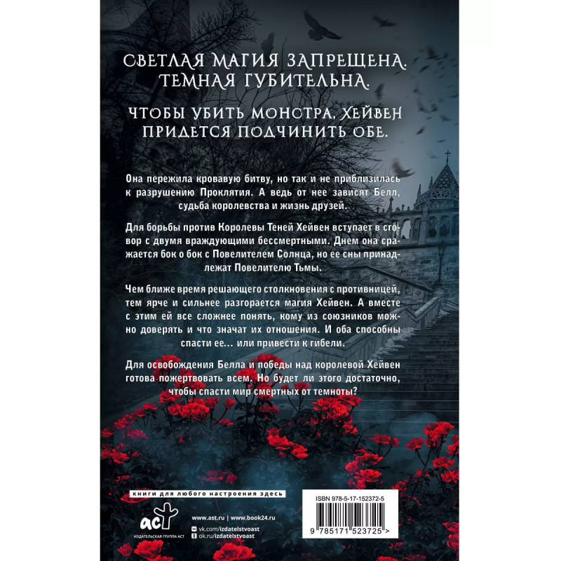 Разрушительница проклятий. Захватывающее приключенческое фэнтези с сильной героиней, любовной линией и яркими, оригинальными квестами! Для всех, кто любит магические истории на пике эмоций! Светлая магия под запретом. Темная слишком опасна. Но Хейвен придется использовать обе, чтобы одолеть монстра. Она едва выжила, но так и не подобралась к разрушению Проклятия. Чтобы это стало возможным, ей пришлось заключить пакты с враждующими бессмертными. Днем она бьется рядом с Повелителем солнца. Но ее сны принадлежат Повелителю Тьмы. Чем ближе финал, тем сложнее понять, кому из двоих можно доверять. Оба могут уничтожить ее - и спасти. Для освобождения лучшего друга, попавшего в лапы монстров, она пойдет на любой риск. Но сможет ли она справиться со Тьмой, если та решит наступать?