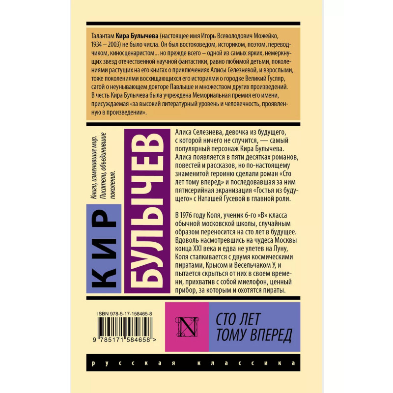 Сто лет тому вперед. Алиса Селезнева, девочка из будущего, с которой ничего не случится, - самый популярный персонаж Кира Булычева. Алиса появляется в пяти десятках романов, повестей и рассказов, но по-настоящему знаменитой героиню сделали роман "Сто лет тому вперед" и последовавшая за ним пятисерийная экранизация "Гостья из будущего" с Наташей Гусевой в главной роли. В 1976 году Коля, ученик 6-го "В" класса обычной московской школы, случайным образом переносится на сто лет в будущее. Вдоволь насмотревшись на чудеса Москвы конца XXI века и едва не улетев на Луну, Коля сталкивается с двумя космическими пиратами, Крысом и Весельчаком У, и пытается скрыться от них в своем времени, прихватив с собой миелофон, ценный прибор, за которым и охотятся пираты.