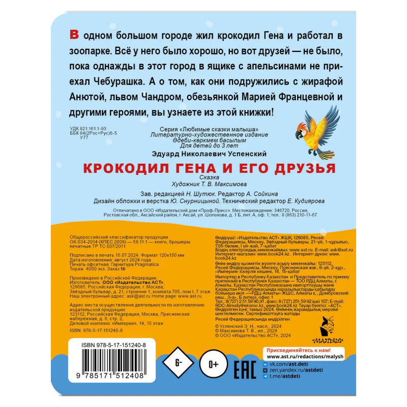 В одном большом городе жил крокодил Гена и работал в зоопарке. Всё у него было хорошо, но вот друзей не было, пока однажды в этот город в ящике с апельсинами не при- ехал Чебурашка. А о том, как они подружились с жирафой Анютой, львом Чандром, обезьянкой Марией Францевной и другими героями, вы узнаете из этой книжки! Эдуард Николаевич Успенский - классик отечественной детской литературы. Его истории про Крокодила Гену и Чебурашку очень нравятся маленьким читателям, ведь они смешные, динамичные и интересные. В этой книге текст дополнен иллюстрациями современной художницы Татьяны Максимовой. Эта книга предназначена именно для малышей: в ней яркие рисунки и крупные буквы, плотный картон не порвется при чтении, а скругленные уголки не повредят маленькие пальчики.