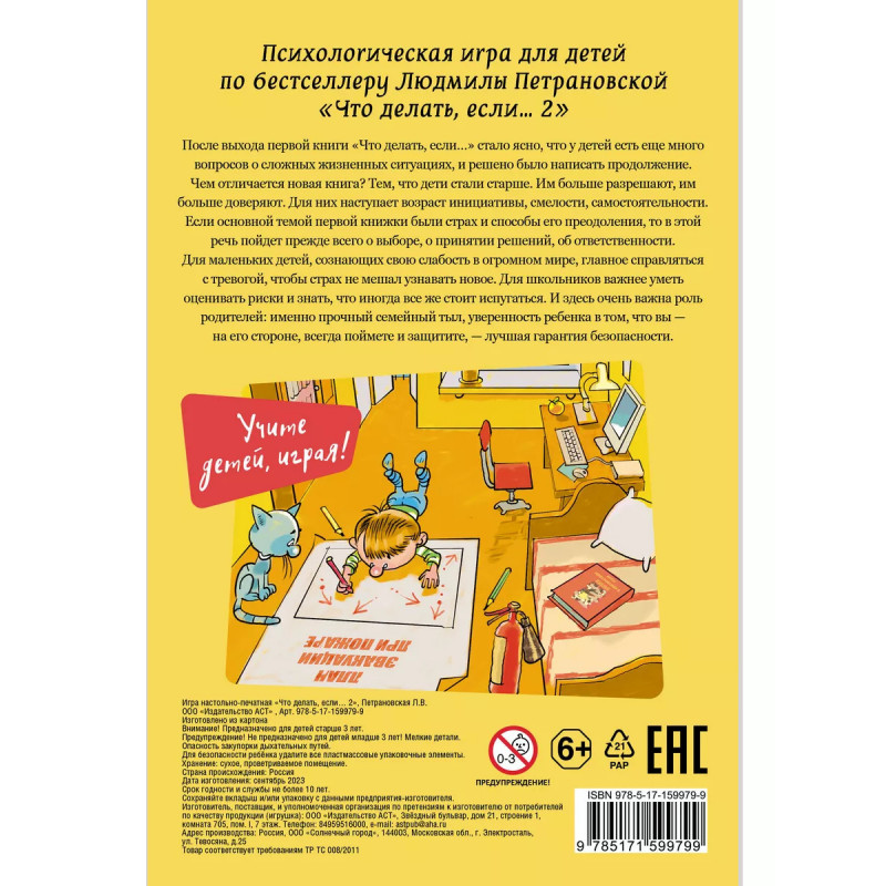 Психологическая игра для детей "Что делать если...-2". Новое оформление. По мере взросления наши дети неизбежно сталкиваются с непростыми для них ситуациями, когда им страшно или очень некомфортно, или они просто не знают, что делать. Это может быть неожиданный звонок в дверь от незнакомца, когда ребёнок остался один дома, недобрые шутки сверстников, встреча со злыми собаками. Страшно потеряться в метро или в торговом центре, и даже просто спать после просмотра страшного фильма. Поэтому важно показать детям, как лучше всего действовать в непредвиденных ситуациях, научить их справляться с паникой и страхами. А что может быть для ребёнка лучше, чем обучение с помощью занимательной игры? Игра "Что делать, если... 2" позволит детям легко освоить не слишком сложные, но безусловно полезные правила поведения в т рудных ситуациях.