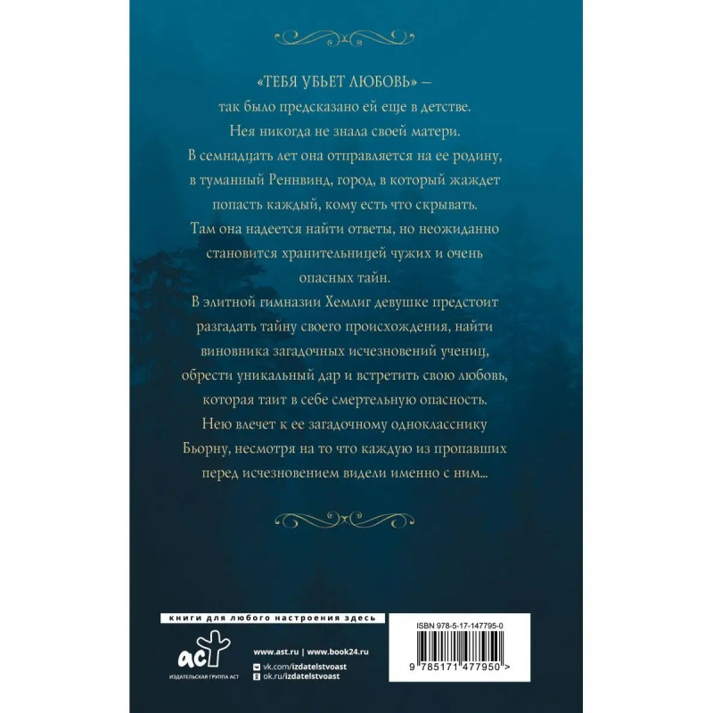 Новые Сумерки по-скандинавски, от которых невозможно оторваться! Неповторимая атмосфера, яркие чувства, тайны и загадки, которые будут держать в напряжении от первой до последней страницы. Добро пожаловать в Реннвинд и постарайтесь выбраться отсюда живыми ТЕБЯ УБЬЕТ ЛЮБОВЬ так было предсказано ей еще в детстве. Нея никогда не знала своей матери. В восемнадцать лет она отправляется на ее родину, в туманный Реннвинд, город, куда жаждет попасть каждый, кому есть, что скрывать. Там она надеется найти ответы, но неожиданно становится хранительницей чужих и очень опасных тайн. В элитной гимназии Хемлиг девушке предстоит разгадать тайну своего происхождения, найти виновника загадочных исчезновений учениц, обрести уникальный дар и встретить свою любовь, которая таит в себе смертельную опасность. Нею влечет к ее загадочному однокласснику Бьорну, несмотря на то, что каждую из пропавших перед исчезновением видели именно с ним