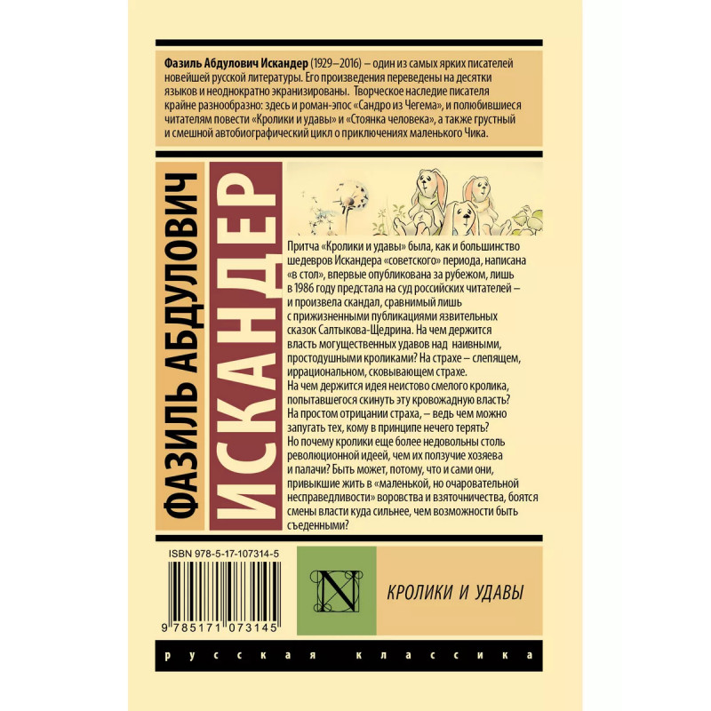 Кролики и удавы. Притча "Кролики и удавы" была, как и большинство шедевров Искандера "советского" периода, написана "в стол", впервые опубликована за рубежом, лишь в 1986 году предстала на суд российских читателей, - и произвела скандал, сравнимый лишь с прижизненными публикациями язвительных сказок Салтыкова-Щедрина. На чем держится власть могущественных удавов над наивными, простодушными кроликами? На страхе - слепящем, иррациональном, сковывающем страхе. На чем держится идея неистово смелого кролика, попытавшегося скинуть эту кровожадную власть? На простом отрицании страха, - ведь чем можно запугать тех, кому в принципе нечего терять? Но почему кролики еще более недовольны столь революционной идеей, чем их ползучие хозяева и палачи? Быть может, потому, что и сами они, привыкшие жить в "маленькой, но очаровательной несправедливости" воровства и взяточничества, боятся смены власти куда сильнее, чем возможности быть съеденными?
