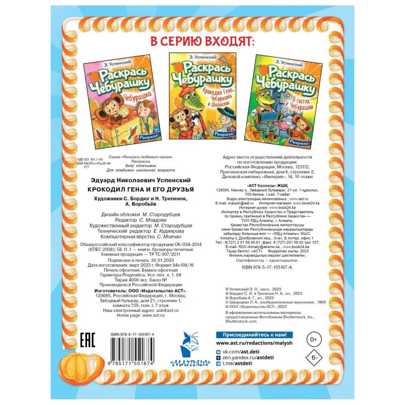 Специально для этой раскраски Э.Н. Успенский написал короткие тексты. У Чебурашки и крокодила Гены много друзей, но есть и один недруг старуха Шапокляк. Она обожает всем досаждать, но в конце концов Гена и Чебурашка решили, что с ней можно подружиться. Раскрашивать Чебурашку и его друзей можно карандашами и фломастерами. Для младшего школьного возраста.