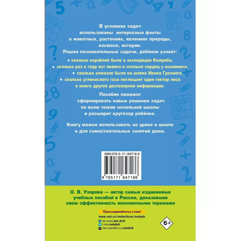 Пособие поможет сформировать навык решения задач по всем темам курса математики начальной школы и расширит кругозор ребёнка. В условиях задач - интересные сведения о животных, растениях, явлениях природы, космосе, истории. Решая задачи, ребёнок узнает, сколько кораблей было в первой экспедиции Колумба; сколько сердец у осьминога; на сколько меньше крыльев у комара, чем у пчелы; сколько спутников у Нептуна; сколько алмазов было на шапке царя Ивана Грозного; сколько раз в году ест пиявка и много других достоверных фактов.