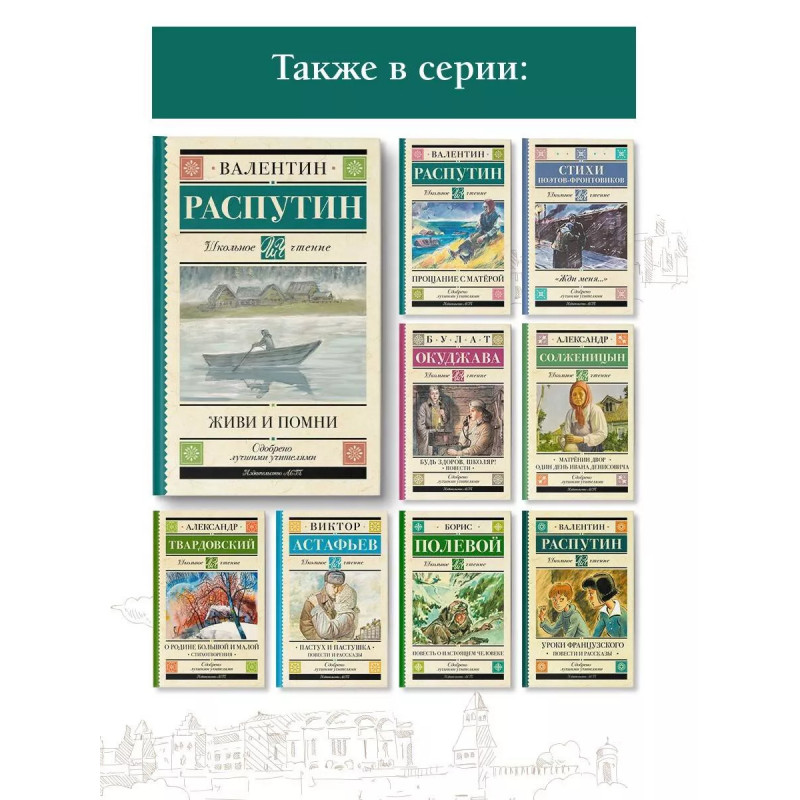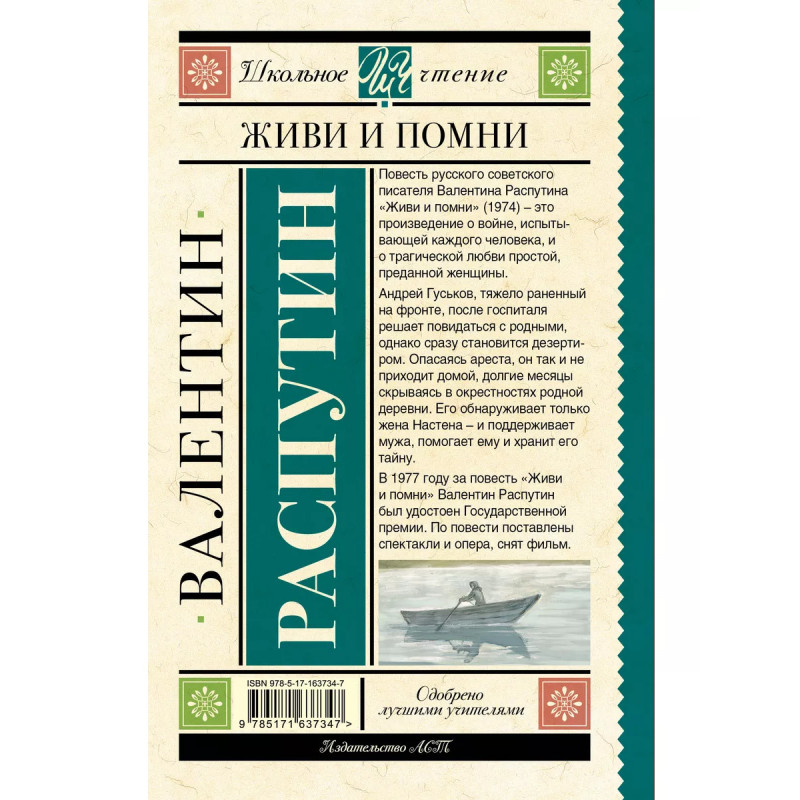 Повесть русского советского писателя Валентина Распутина "Живи и помни" (1974) это произведение о войне, испытывающей каждого человека, и о трагической любви простой, преданной женщины. Андрей Гуськов, тяжело раненный на фронте, после госпиталя решает повидаться с родными, однако сразу становится дезертиром. Опасаясь ареста, он так и не приходит домой, долгие месяцы скрываясь в окрестностях родной деревни. Его обнаруживает только жена Настена и поддерживает мужа, помогает ему и хранит его тайну. В 1977 году за повесть "Живи и помни" Валентин Распутин был удостоен Государственной премии. По повести поставлены спектакли и опера, снят фильм.