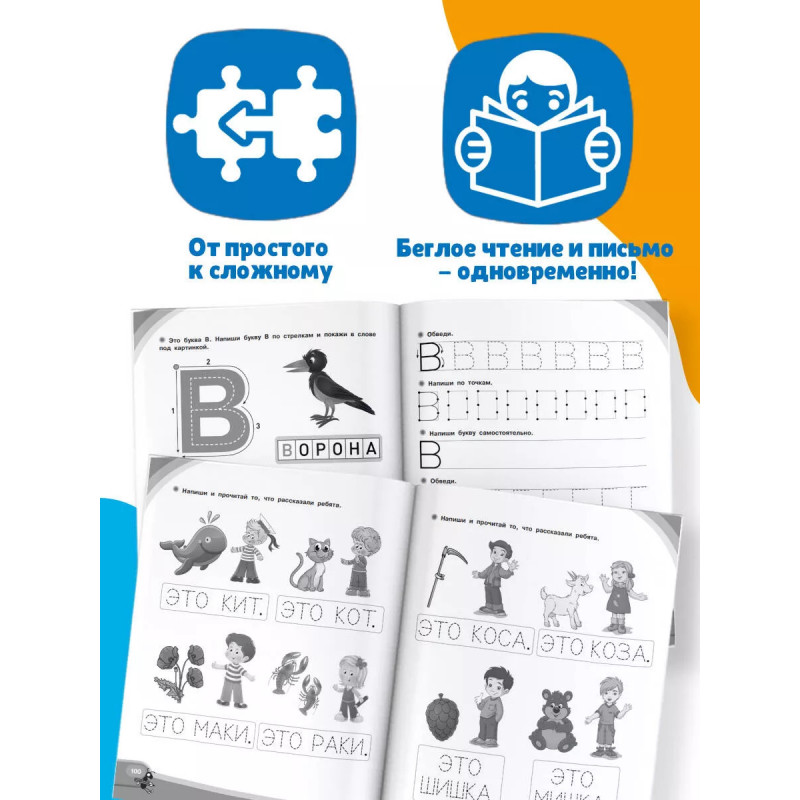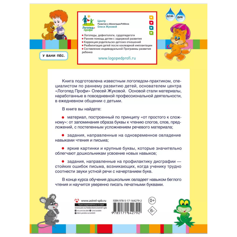 Книга подготовлена известным логопедом-практиком, специалистом по раннему развитию детей, основателем центра Логопед Профи Олесей Жуковой. Выполняя задания, дошкольник овладеет навыком беглого чтения и научится уверенно писать печатными буквами. В книге вы найдете: материал, построенный по принципу от простого к сложному: от запоминания образа буквы к чтению слогов, слов, предложений, с постепенным усложнением речевого материала (от простых слов к сложным, от коротких предложений к распространенным); задания, направленные на одновременное овладение навыками чтения и письма; яркие картинки и крупные буквы, которые значительно облегчают дошкольникам усвоение новых знаний; задания, направленные на профилактику дисграфии, стойких ошибок письма, возникающих, когда ученику трудно соотнести звуки устной речи с начертанием букв.