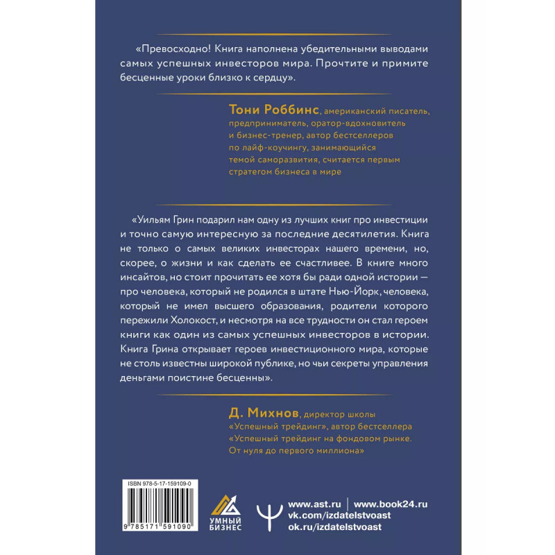 Знаменитый Тони Роббис написал, что эта книга "наполнена убедительными выводами самых успешных инвесторов мира. Прочтите и примите бесценные уроки". Эта книга знакомит с великими инвесторами, настоящими легендами мира финансов. Обычно мы со скепсисом относимся к советам миллионеров, наставлениям из серии "выйти из зоны комфорта" и рассказам о том, кто и как разбогател. Очевидно, что акулы бизнеса гениальны, но можно ли повторить их успех? У автора этой книги особый подход. Известный журналист The New Yorker, Time, Fortune, Forbes, The Economist Уильям Грин провел сотни интервью со знаменитыми суперинвесторами и обнаружил, что ключевые идеи создания богатства применимы во всех сферах. Эта книга о законах инвестирования. Финансовые гении честно расскажут, как они побеждают на рынке.