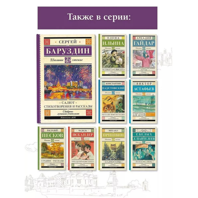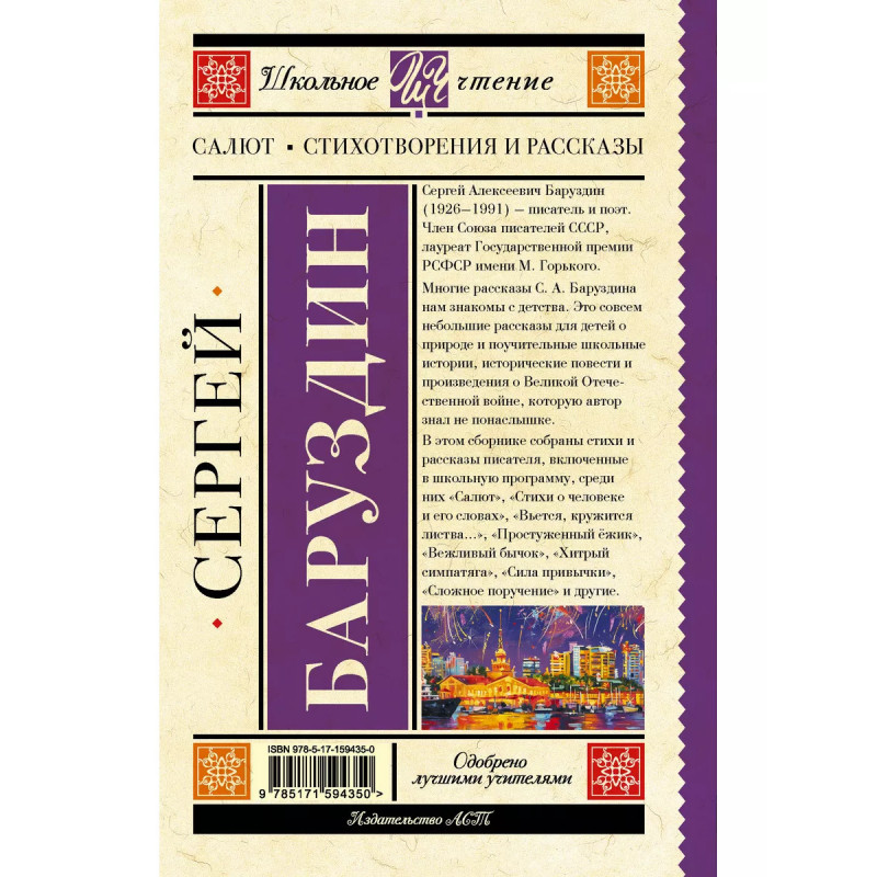 Салют. Стихотворения и рассказы. Сборник советского писателя и поэта Сергей Алексеевича Баруздина составили его самые популярные стихи для детей, например "Салют", "Стихи о человеке и его словах", и рассказы, среди которых ставшие знаменитыми "Рави и Шаши", "Как Снежок в Индию попал", "Простуженный ёжик", "Вежливый бычок" и многие-многие другие произведения о природе и животных. Книга будет интересна младшим школьникам. Отдельные стихотворения и рассказы С. Баруздина, включенные в книгу, входят в школьную программу.