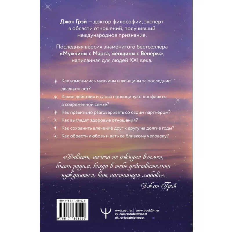 Более 30 лет назад психолог Джон Грэй издал книгу, которая перевернула представления об отношениях, "Мужчины с Марса, женщины с Венеры". Эта книга убедительно доказала, что мужчины и женщины мыслят, чувствуют и действуют по-разному. И это была настоящая сенсация! Изучая книгу, сотни тысяч мужчин и женщин по всему миру учились понимать друг друга, становились счастливыми, спасали отношения. После издания книги Джон Грэй продолжал работу с парами, консультировал, внимательно изучал тенденции нового мира. Так появилась новая версия знаменитого бестселлера, которая объединяет в себе открытия оригинала с современным взглядом на отношения. Из этой книги вы узнаете: Как изменились мужчины и женщины за последние двадцать лет? Какие действия и слова провоцируют конфликты в современной семье? Как правильно разговаривать со своим партнером? Как выглядят здоровые отношения? Как сохранить влечение друг к другу на долгие годы? Как обрести любовь и дать ее близкому человеку? И многое другое!
