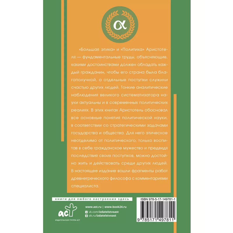 Большая этика и Политика Аристотеля фундаментальные труды, объясняющие, какими достоинствами должен обладать каждый гражданин, чтобы его страна была благополучной, а отдельные поступки служили счастью других людей. Тонкие аналитические наблюдения великого систематизатора науки актуальны и в современных политических реалиях. В этих книгах Аристотель обосновал все основные понятия политической науки, в соответствии со стратегическими задачами государства и общества. Для него этическое неотделимо от политического, только воспитав в себе гражданское мужество и предвидя последствия своих поступков, можно достойно жить и действовать среди других людей. В настоящее издание вошли фрагменты работ древнегреческого философа с комментариями специалиста.