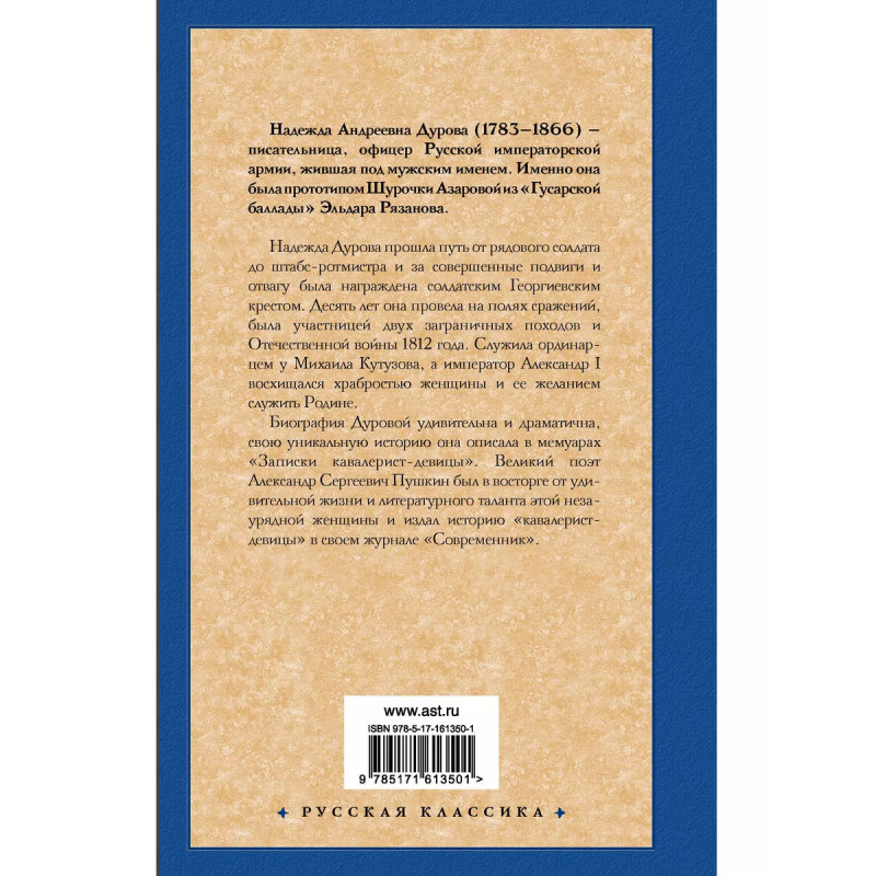 Записки кавалерист-девицы. Надежда Дурова прошла путь от рядового солдата до штабс-ротмистра и за совершенные подвиги и отвагу была награждена солдатским Георгиевским крестом. Десять лет она провела на полях сражений, была участницей двух заграничных походов и Отечественной войны 1812 года. Служила ординарцем у Михаила Кутузова, а император Александр I восхищался храбростью женщины и ее желанием служить Родине. Биография Дуровой удивительна и драматична, свою уникальную историю она описала в мемуарах "Записки кавалерист-девицы". Великий поэт Александр Сергеевич Пушкин был в восторге от удивительной жизни и литературного таланта этой незаурядной женщины и издал историю "кавалерист-девицы" в своем журнале "Современник".