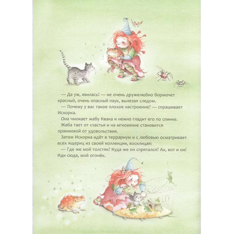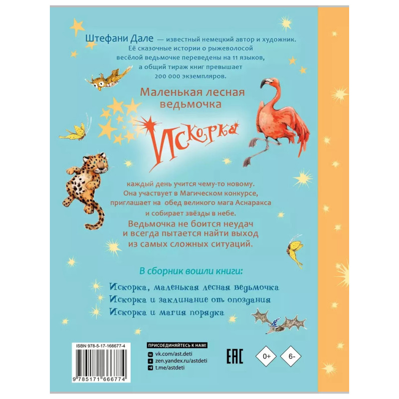 Маленькая лесная ведьмочка Искорка каждый день учится чему-то новому. Она практикуется в искусстве заклинаний, участвует в Магическом конкурсе, приглашает на обед великого мага Аснаракса и собирает звёзды в небе. Она не боится неудач и всегда пытается найти выход из самых сложных ситуаций. Книги о рыжеволосой весёлой ведьмочке Искорке немецкой художницы Штефани Дале любят дети по всему свету. Общий тираж книг составил уже более 200 000 экземпляров, а серия переведена на 11 языков. В сборник "Искорка. Большая книга приключений" вошли книги "Искорка, маленькая лесная ведьмочка", "Искорка и магия порядка".