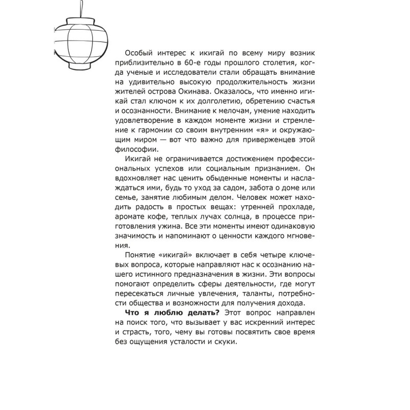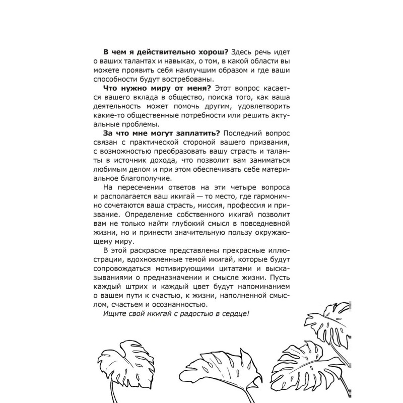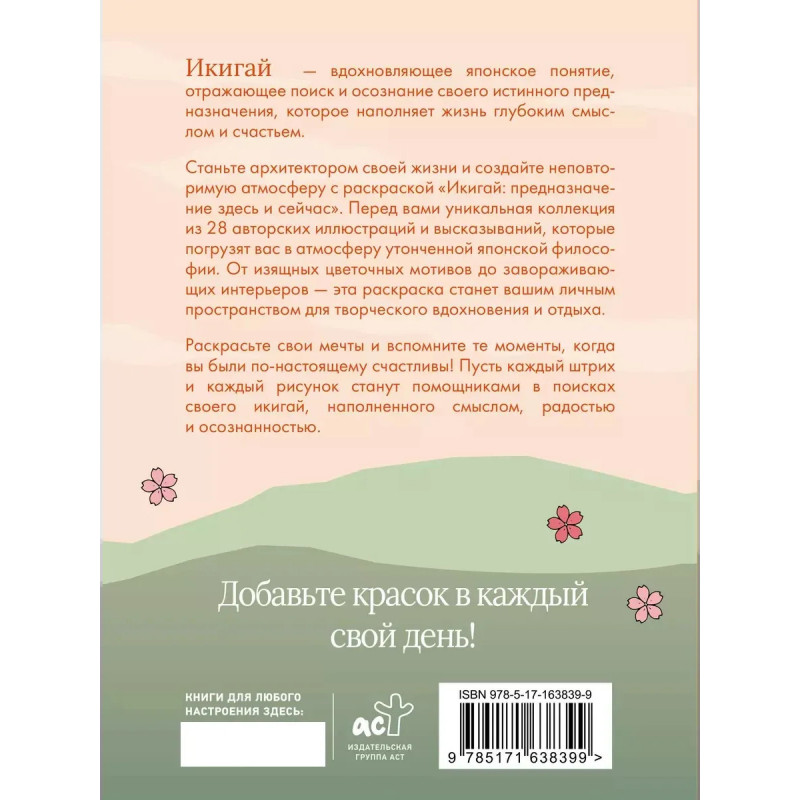 Икигай вдохновляющее японское понятие, отражающее поиск и осознание своего истинного предназначения, которое наполняет жизнь глубоким смыслом и счастьем. Станьте архитектором своей жизни и создайте неповторимую атмосферу с раскраской "Икигай: предназначение здесь и сейчас". Перед вами уникальная коллекция из 28 авторских иллюстраций и высказываний, которые погрузят вас в атмосферу утонченной японской философии. От изящных цветочных мотивов до завораживающих интерьеров эта раскраска станет вашим личным пространством для творческого вдохновения и отдыха. Раскрасьте свои мечты и вспомните те моменты, когда вы были по-настоящему счастливы! Пусть каждый штрих и каждый рисунок станут помощниками в поисках своего икигай, наполненного смыслом, радостью и осознанностью. Добавьте красок в каждый свой день!