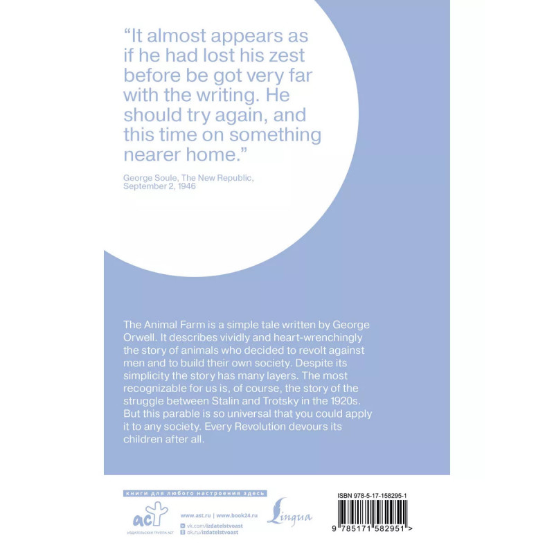 Animal Farm. Добро пожаловать на "Скотный двор"! Здесь животные построили своё, справедливое, общество. Мы живём бок о бок, мы совершенно равны, и вместе трудимся на общее благо. Просторные загоны, честная трудовая пайка, сообщество единомышленников - здесь будет всё, о чем только можно мечтать. И никаких назойливых людей. Здесь больше не свистнет бич в руках человека, и некому будет понукать честных трудяг. Не упустите свой шанс присоединиться к нам и наслаждаться жизнью вместе с нами! Сделаем весь мир таким, как "Скотный двор"! "Скотный двор" - сатирическая повесть Джорджа Оруэлла. Язык её прост и понятен, и потому доступен даже начинающему читателю. Повесть дана в оригинале, без сокращений и адаптации.