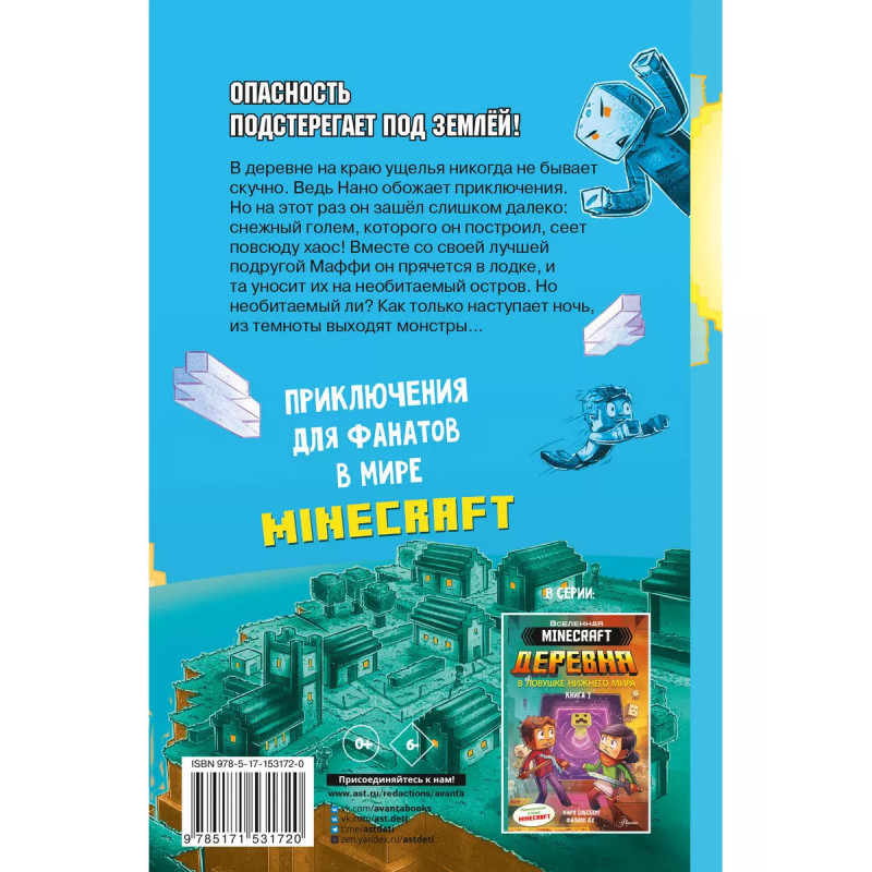 Minecraft. ДЕРЕВНЯ. Побег с изумрудного острова. ОПАСНОСТЬ ПОДСТЕРЕГАЕТ ПОД ЗЕМЛЁЙ! В деревне на краю ущелья никогда не бывает скучно. Ведь Нано обожает приключения. Но на этот раз он зашёл слишком далеко: снежный голем, которого он построил, сеет повсюду хаос! Вместе со своей лучшей подругой Маффи он прячется в лодке, и та уносит их на необитаемый остров. Но необитаемый ли? Как только наступает ночь, из темноты выходят монстры