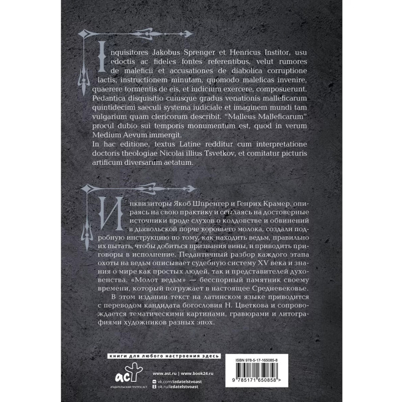 Инквизиторы Якоб Шпренгер и Генрих Крамер, опираясь на свою практику и ссылаясь на достоверные источники вроде слухов о колдовстве и обвинений в дьявольской порче коровьего молока, создали подробную инструкцию по тому, как находить ведьм, правильно их пытать, чтобы добиться признания вины, и приводить приговоры в исполнение. Педантичный разбор каждого этапа охоты на ведьм описывает судебную систему XV века и знания о мире как простых людей, так и представителей духовенства. "Молот ведьм" бесспорный памятник своему времени, который погружает в настоящее Средневековье. В этом издании текст на латинском языке приводится с параллельным переводом кандидата богословия Н. Т. Цветкова. Для удобства чтения каждая глава на русском языке стоит напротив соответствующей главы на латинском. Параллельно расположенный текст позволит без труда сравнивать оригинал с переводом, обращать внимание на трудности, с которыми сталкивался переводчик, и отмечать наиболее точно переведенные фрагменты.