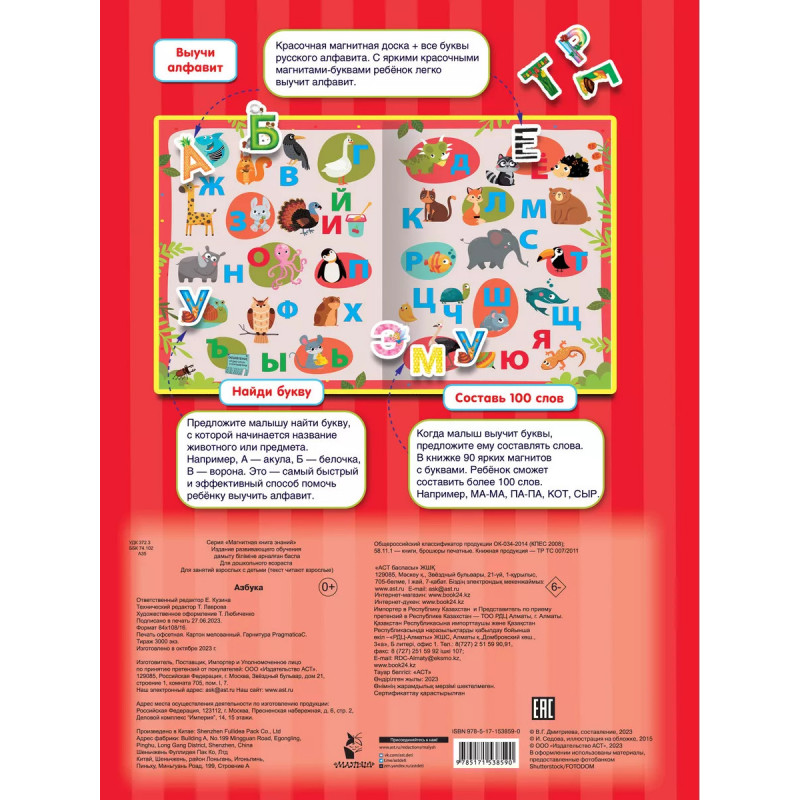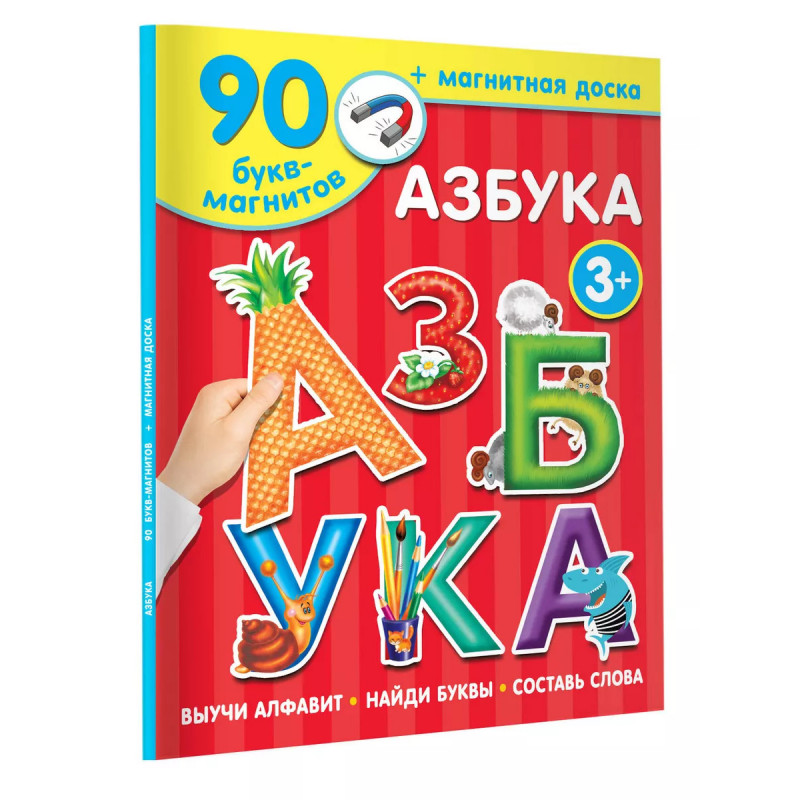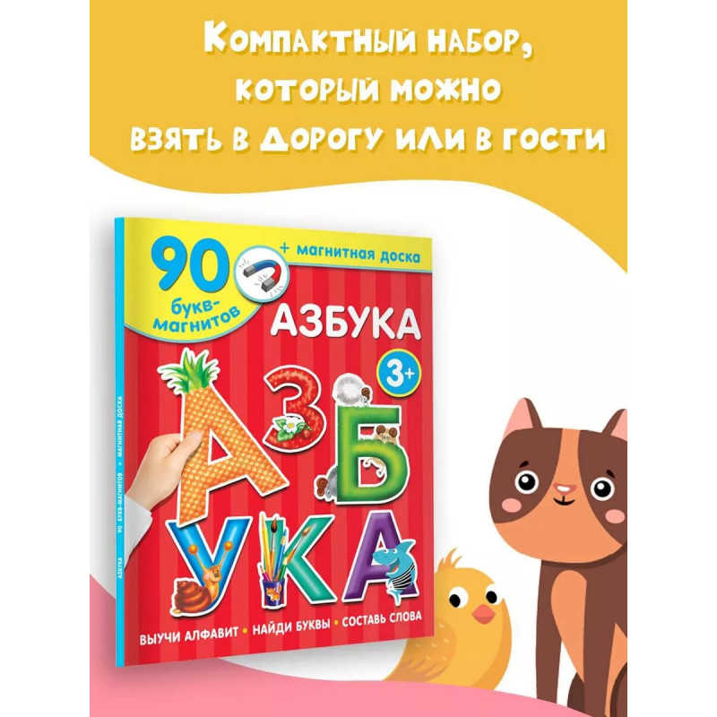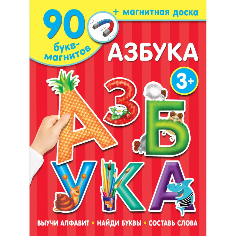 Азбука. Что делать, если малыш совсем не хочет учить буквы? На помощь мамам, папам, бабушкам и дедушкам придёт магнитная книга "Азбука". Ребёнок сам решит, куда прикрепить магнитик с буквой, а ещё сможет сложить первые слоги и слова прямо на страницах книги. Это компактный игровой набор с красочными разворотами, который можно взять в дорогу или в гости. Плотные магниты сделаны качественно и не будут отклеиваться от страничек книги. А ещё их можно прикрепить на холодильник или магнитную доску. Занятия с магнитной книгой "Азбука" помогут малышу изучить буквы, разовьют память, внимание и мелкую моторику.
