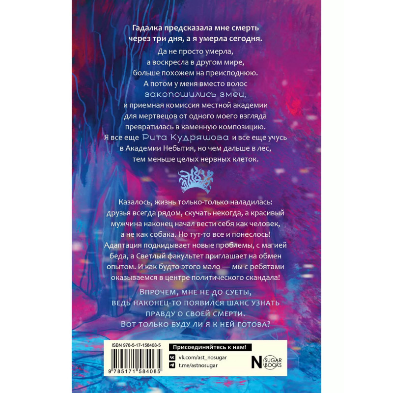 Академия небытия. Как не умереть дважды. Необычная фэнтези-история с элементами детектива и комедии в интерьерах магической академии и загробного мира, куда совершенно случайно попадает главная героиня - обычная наша современница. Вот только зачем она попала туда и кому нужна ее смерть, ведь призраки академии постоянно повторяют, что она здесь не случайно. Эту и множество других загадок пытается разгадать Рита Кудряшова, вчерашняя студентка, а ныне Медуза Горгона со змеями вместо волос, умеющая обращать врагов в настоящие камни. Я всё ещё Рита Кудряшова и всё ещё учусь в Академии Небытия, но чем дальше в лес, тем меньше целых нервных клеток. Казалось, жизнь только-только наладилась: друзья всегда рядом, скучать некогда, а красивый мужчина наконец начал вести себя как человек (а не собака), и тут понеслось! Адаптация подкидывает новые проблемы, с магией беда, а Светлый факультет приглашает на обмен опытом. И как будто этого мало - мы с ребятами оказываемся в центре политического скандала! Впрочем, мне не до суеты, ведь наконец-то появился шанс узнать