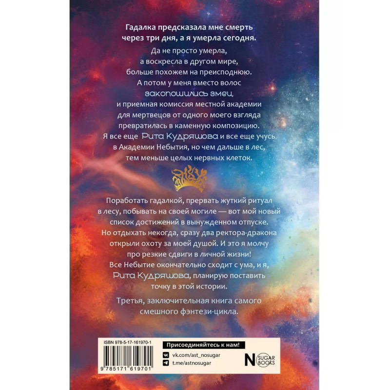 Академия небытия. Умирать так с музыкой. Заключительная часть самой необычной фэнтези-истории с элементами детектива и комедии в интерьерах магической академии и загробного мира. Жизнь Риты Кудряшовой, а точнее, Риты Змеешовой, круто изменилась, когда она стала студенткой загробной академии, но вот сейчас Небытие подкидывает все новые и новые сюрпризы, справиться с которыми не могут помочь даже друзья. Особенно когда сразу два дракона-ректора желают заполучить себе Ритину душу, чтобы наконец закончить многовековое соревнование. Но у студентки Змеешовой совершенно другие планы на свою душу и свою жизнь, какой бы она теперь ни была.