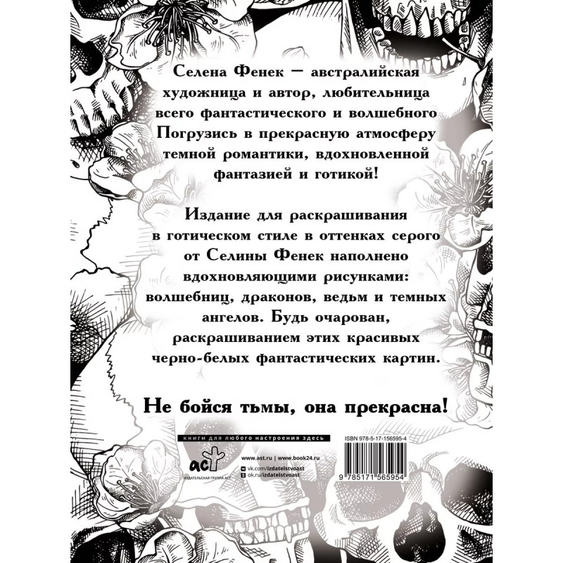 Темная готика. Селена Фенек - австралийская художница и автор, любительница всего фантастического и волшебного Погрузись в прекрасную атмосферу темной романтики, вдохновленной фантазией и готикой! "Темная готика" - это раскраска, которая погружает вас в мир мистической и мрачной атмосферы. Эта раскраска предлагает вам возможность исследовать темные и готические мотивы с помощью кистей и красок. Примите вызов и окунитесь в увлекательное путешествие по замкам, склепам и таинственным ландшафтам. Раскрасьте мрачные фасады замков, оживите склепы и придайте жизнь готическим персонажам. Сочетайте темные оттенки и яркие акценты, чтобы создать эффектные контрасты, отражающие дух темной готики. Используйте свою фантазию и творчество, чтобы добавить детали и элементы, которые будут выделяться на фоне темных и мистических сцен. Не бойся тьмы, она прекрасна!