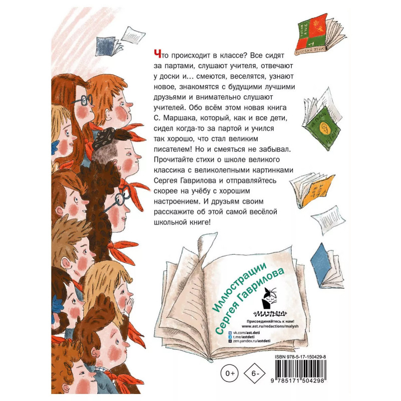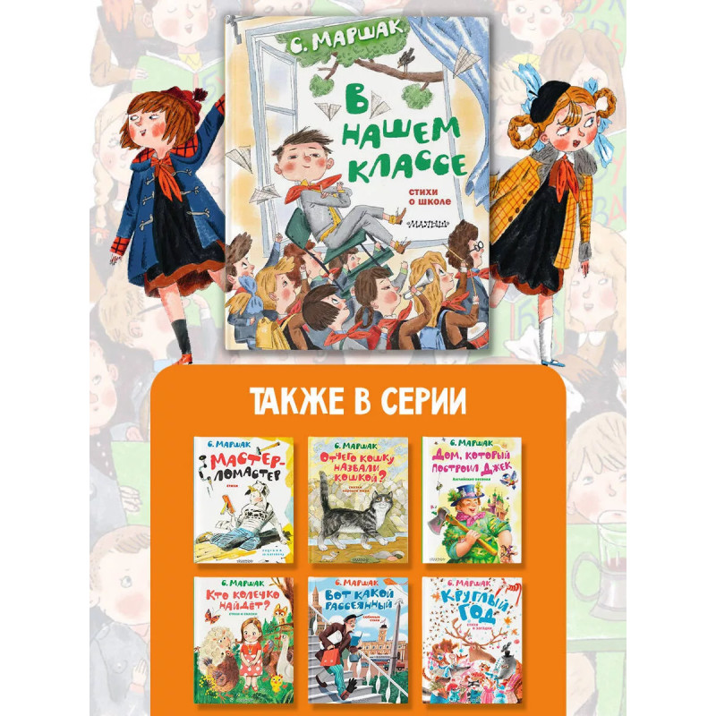 В нашем классе. Стихи о школе. Что происходит в классе? Все сидят за партами, слушают учителя, отвечают у доски и смеются, веселятся, узнают новое, знакомятся с будущими лучшими друзьями и внимательно слушают учителей. Обо всём этом новая книга С. Маршака, который, как и все дети, сидел когда-то за партой и учился так хорошо, что стал великим писателем! Но и смеяться не забывал. Прочитайте стихи о школе великого классика с великолепными картинками Сергея Гаврилова и отправляйтесь скорее на учёбу с хорошим настроением. И друзьям своим расскажите об этой самой весёлой школьной книге!