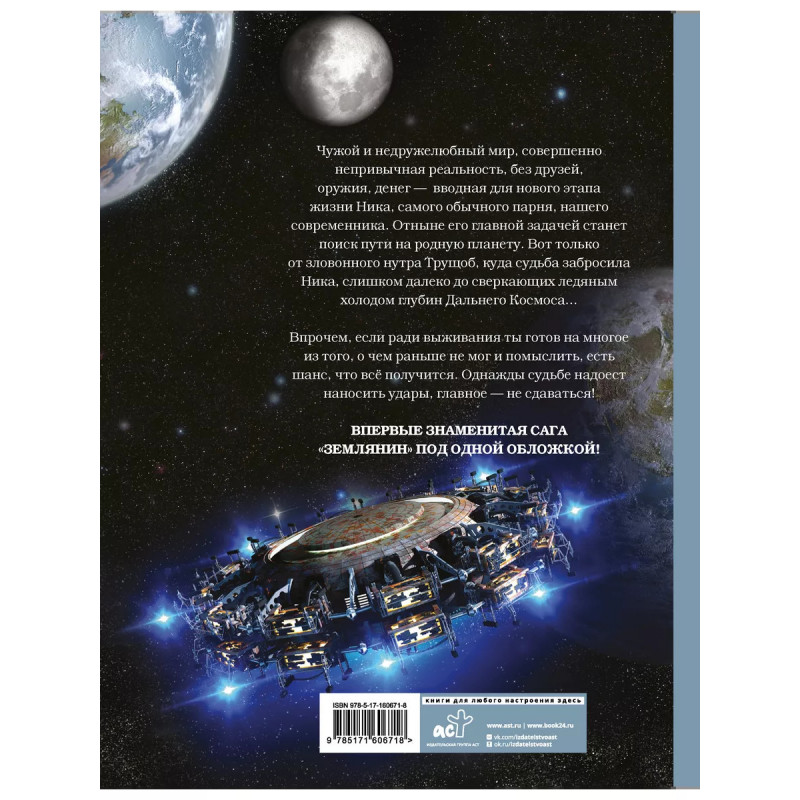 Чужой и недружелюбный мир, совершенно непривычная реальность, без друзей, оружия, денег - вводная для нового этапа жизни Ника, самого обычного парня, нашего современника. Отныне его главной задачей станет поиск пути на родную планету. Вот только от зловонного нутра Трущоб, куда судьба забросила Ника, слишком далеко до сверкающих ледяным холодом глубин Дальнего Космоса Впрочем, если ради выживания ты готов на многое из того, о чем раньше не мог и помыслить, есть шанс, что всё получится. Однажды судьбе надоест наносить удары, главное - не сдаваться! Впервые знаменитая тетралогия "Землянин" в одном томе!