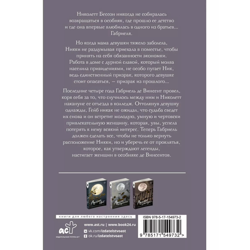 Лунное искушение. Николетт Бессон никогда не собиралась возвращаться в особняк, где прошло ее детство и где она впервые влюбилась в одного из братьев Габриеля. Но когда мама девушки тяжело заболела, Никки не раздумывая приехала в поместье, чтобы принять на себя обязанности экономки. Работа в доме с дурной славой, который молва населила привидениями, не особо пугает Ник, ведь единственный призрак, которого девушке стоит опасаться, - призрак из прошлого Последние четыре года Габриель де Винсент провел, коря себя за то, что случилось между ним и Николетт накануне ее отъезда в колледж. Оттолкнув девушку однажды, Гейб никак не ожидал, что судьба сведет их снова и он встретит молодую, умную и чертовски привлекательную женщину, которая, увы, успела потерять к нему всякий интерес. Теперь Габриель должен сделать все, чтобы не только вернуть расположение Никки, но и уберечь ее от проклятья, которое, как утверждают легенды, настигает женщин в особняке де Винсентов.