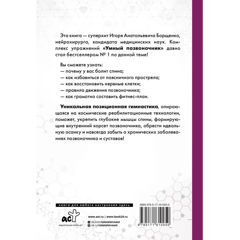 Система "Умный позвоночник". Эта книга - суперхит Игоря Анатольевича Борщенко, нейрохирурга, кандидата медицинских наук. Комплекс упражнений "Умный позвоночник" давно стал бестселлером № 1 по данной теме! Вы сможете узнать: - почему у вас болит спина; - как избавиться от поясничного прострела; - как восстановить нервные клетки; - правила движения позвоночника; - как грамотно составить фитнес-план. Уникальная позиционная гимнастика, опирающаяся на космические реабилитационные технологии, поможет, укрепить глубокие мышцы спины, формирующие внутренний корсет позвоночника, обрести идеальную осанку и навсегда забыть о хронических заболеваниях позвоночника и суставов!