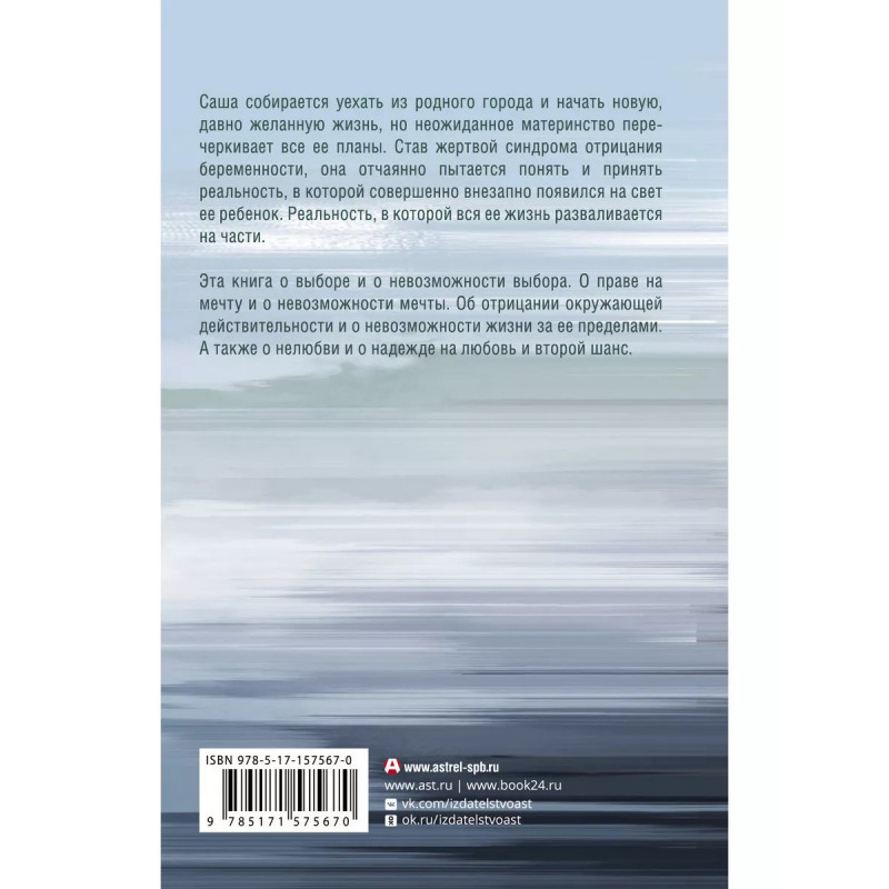 Ожидание. Саша собирается уехать из родного города и начать новую, давно желанную жизнь, но неожиданное материнство перечеркивает все ее планы. Став жертвой синдрома отрицания беременности, она отчаянно пытается понять и принять реальность, в которой совершенно внезапно появился на свет ее ребенок. Реальность, в которой вся ее жизнь разваливается на части. Эта книга о выборе и о невозможности выбора. О праве на мечту и о невозможности мечты. Об отрицании окружающей действительности и о невозможности жизни за ее пределами. А также о нелюбви и о надежде на любовь и второй шанс.