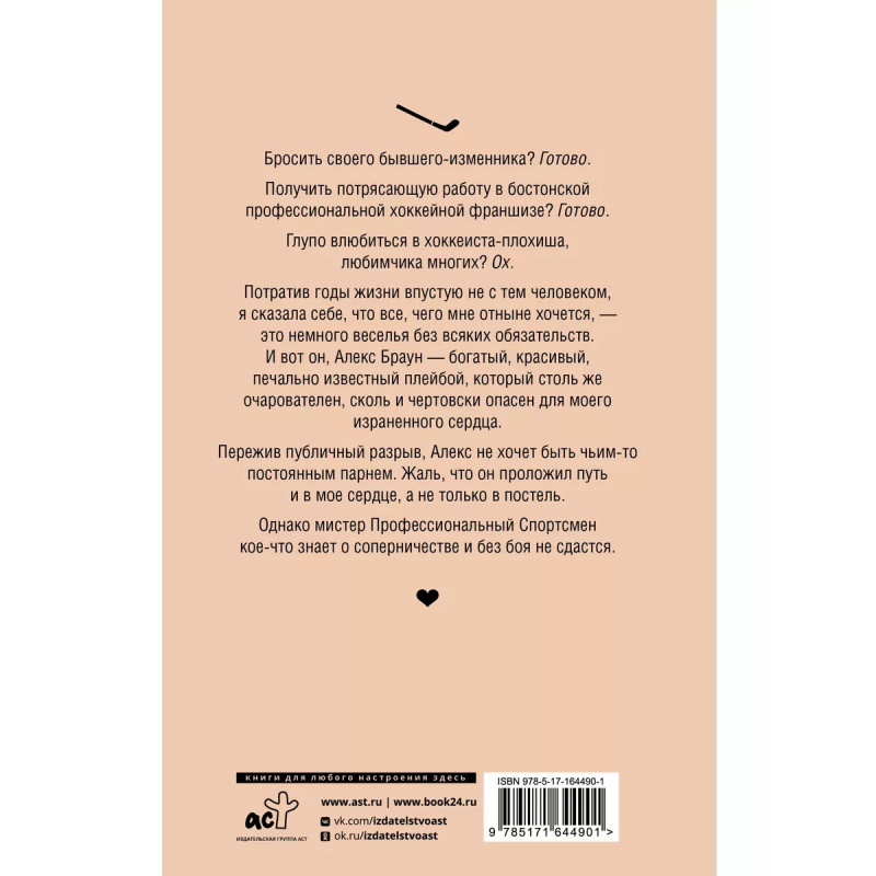 Бросить своего бывшего-изменника? Готово. Получить потрясающую работу в бостонской профессиональной хоккейной франшизе? Готово. Глупо влюбиться в хоккеиста-плохиша, любимчика многих? Ох. Потратив годы жизни впустую не с тем человеком, я сказала себе, что все, чего мне отныне хочется, это немного веселья без всяких обязательств. И вот он, Алекс Браун богатый, красивый, печально известный плейбой, который столь же очарователен, как и чертовски опасен для моего израненного сердца. Пережив публичный разрыв, Алекс не хочет быть чьим-то постоянным парнем. Жаль, что он проложил путь и в мое сердце, а не только в постель. Однако мистер Профессиональный Спортсмен кое-что знает о соперничестве и без боя не сдастся.