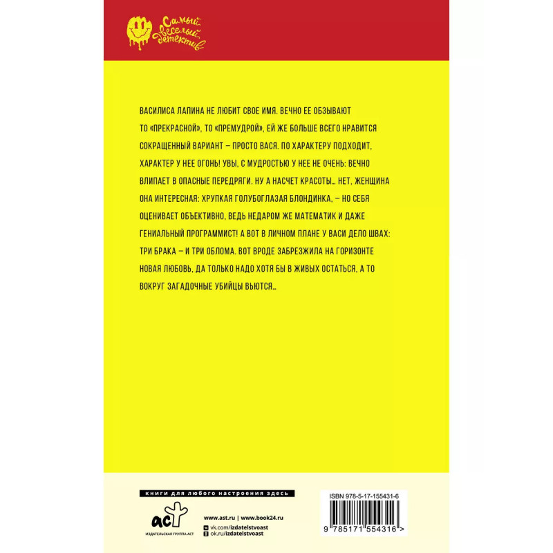 Тетя без присмотра. Василиса Лапина не любит свое имя. Вечно ее обзывают то "прекрасной", то "премудрой", ей же больше всего нравится сокращенный вариант - просто Вася. По характеру подходит, характер у нее огонь! Увы, с мудростью у нее не очень: вечно влипает в опасные передряги. Ну а насчет красоты Нет, женщина она интересная: хрупкая голубоглазая блондинка, - но себя оценивает объективно, ведь недаром же математик и даже гениальный программист! А вот в личном плане у Васи дело швах: три брака - и три облома. Вот вроде забрезжила на горизонте новая любовь, да только надо хотя бы в живых остаться, а то вокруг загадочные убийцы вьются