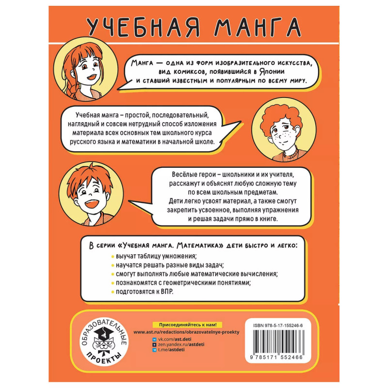 Учебная манга. Математика. Запоминаем таблицу умножения. Учебная манга - новая серия книг издательства АСТ. Манга - одна из форм изобразительного искусства, вид комиксов, появившийся в Японии и ставший известным и популярным по всему миру. Учебная манга - простой, последовательный, наглядный и совсем нетрудный способ изложения материала всех основных тем школьного курса русского языка и математики в начальной школе. Весёлые герои - ровесники младших школьников и их учителя, расскажут и объяснят любую сложную тему по всем школьным предметам. Дети легко усвоят материал, а также смогут закрепить усвоенное, выполняя упражнения и решая задачи прямо в книге. В серии "Учебная манга. Математика" дети быстро и легко: - выучат таблицу умножения; - научатся решать разные виды задач; - смогут выполнять любые математические вычисления; - познакомятся с геометрическими понятиями; - подготовятся к ВПР.